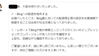 Microsoft広告を運用するようになったらYahoo広告経由でBingに広告を出していると紛らわしいので止めたほうがいいのかな?などと考えました。私は「あれ?Bingなどのパートナーへの出稿って停止できるんだっけ?それと、どのくらい提携サイトでインプレッションやコンバージョンがあったかのデータを出せるんだっけ?」と気になりました。そこでYahoo!広告のサポートにチャットで聞いてみました。